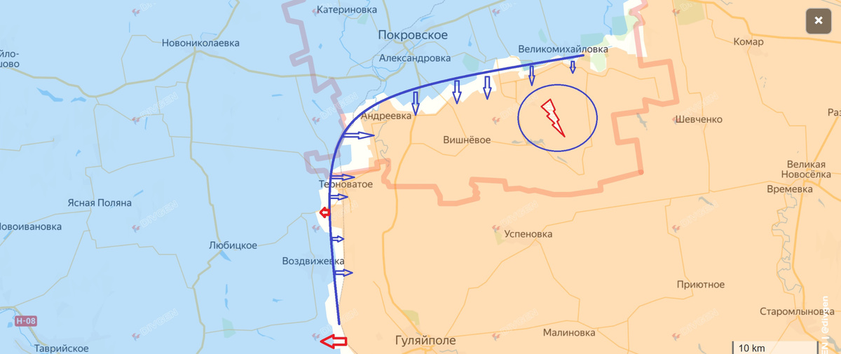 На восточном фасе Запфронта, от Гуляйполя и далее на север вплоть до Орестополя, продолжаются тяжелые бои. Ликвидировать котел южнее Орестополя не удается – не считаясь с потерями пр-к постоянно идет на прорыв с задачей прорваться на бронетехнике и пикапах как можно дальше на юг. То же самое происходит и западнее. Андреевка, Терноватое, Косовцево периодически оказываются в оперативном окружении вплоть до уничтожения дронами прорвавшихся вояк Хунты. На окраинах регулярно идет ближний бой. При этом атакуют и наши. Чуть южнее Терноватого наши прорвались западнее и атакуют Рождественское. Именно здесь весной продолжаться основные бои и именно сюда Мясник будет бросать на переработку все новые и новые порции пушечного мяса. Сюда и западнее. Где переправляясь через обмелевшую речку-вонючку, атакует наши части идущие южнее р.Крынка на восток. Причина очевидна. Контрудары врага носят не столько политический, сколько военный характер. Это попытка предотвратить то, о чем мы говорили в прошлом го