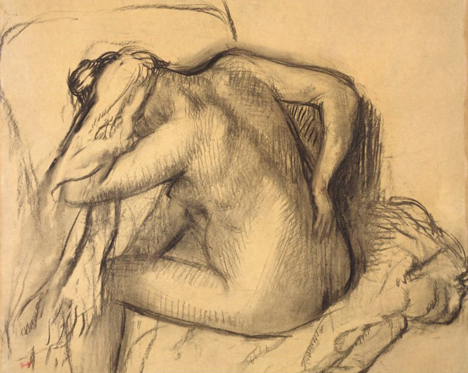 В 1855 году двадцатилетний Эдгара Дега (1834–1917) посетил знаменитого Жана-Огюста-Доминика Энгра (1780–1867), которому тогда было семьдесят четыре года, чтобы сообщить, что друг семьи согласился предоставить для выставки картину Энгра с изображением обнаженной натуры. На этой встрече старший художник призвал своего молодого поклонника постоянно рисовать, как по памяти, так и с натуры. Приняв этот совет близко к сердцу, Дега на протяжении всей своей карьеры отстаивал равенство рисунков и живописи. Хотя Дега редко датировал или выставлял работы после последней групповой выставки импрессионистов в 1886 году, этот рисунок спины обнаженной натуры входит в число многих тесно связанных работ, обычно датируемых серединой 1890-х годов, когда давние коллеги художника, включая Пьера Огюста Ренуара (1841–1919), Поля Сезанна (1839-1906) и Клода Моне (1840–1926), создавали вариации на одни и те же живописные темы. Метод Дега заключалась в том, чтобы сделать рисунок модели углем, а затем наложить