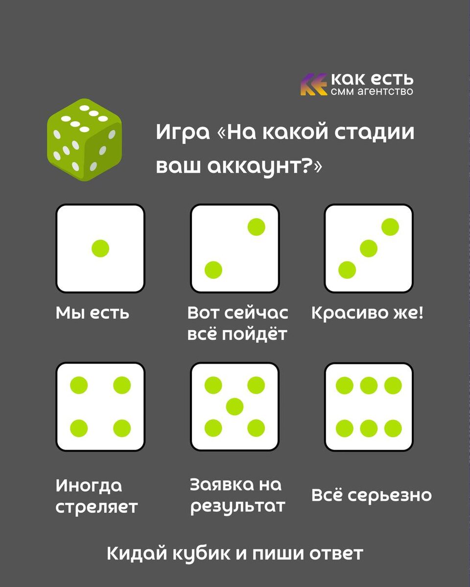 ?» Бросайте кубик (смайлик 🎲) в комментариях и смотрим что выпало😁 1️⃣ “Мы есть” Аккаунт есть. Последний пост был в прошлом году. Шапка профиля менялась 4 раза. Заявок 0. 2️⃣ “Вот сейчас всё пойдёт” Посмотрели парочку блогеров. Сохранили 15 трендов. Сняли 3 рилса. Ждём результат. 3️⃣ “Красиво же!” Лента аккуратная. Все гармонично. Шрифты подобраны. Клиенты почему-то не выстраиваются в очередь. 4️⃣ “Иногда стреляет” Один рилс залетел. Не сбавляем оборотов, надеемся на следующий. 5️⃣ “Заявка на результат” Есть контент-план. Понимание ЦА. Реклама тестируется. У нас все получится. 6️⃣ “Всё серьезно” Есть команда, аналитика, масштабирование. Реклама работает по всем фронтам. 🎲 Конечно, это игра. Но если честно… Поделитесь в комментариях на какой стадии ваш аккаунт сейчас в реальности или вы кинули кости просто по фану?😁