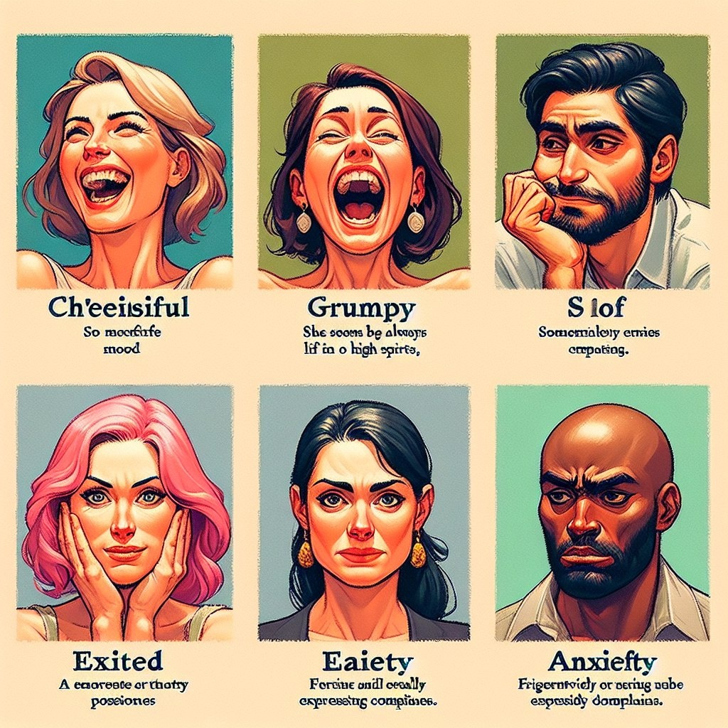 "Cheerful" - весёлый, радостный Используется, когда кто-то всегда в хорошем настроении и радуется жизни. "Grumpy" - ворчливый, раздражительный Кто-то скверный на настроение и часто жалуется. "Relaxed" - расслабленный, спокойный Когда человек спокоен и не переживает особо ни о чём. "Excited" - возбуждённый, взволнованный Чувство радости или волнения при ожидании чего-то позитивного. "Anxious" - тревожный, беспокойный Чувство беспокойства или страха по поводу чего-то. Пример: - "She felt very excited about her upcoming trip." - "Она была очень взволнована предстоящей поездкой." 🌞🚌😊