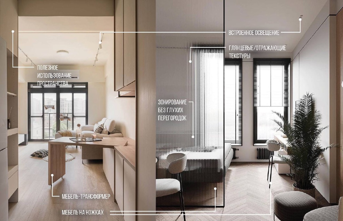 Небольшая площадь требует точных решений. Важно не перегружать пространство и использовать каждый метр осознанно. 1️⃣ Визуальное расширение Светлая палитра без резких контрастов, глянцевые и отражающие поверхности, стекло и зеркала помогают сделать интерьер легче и светлее. Чем меньше визуального дробления, тем просторнее воспринимается помещение. 2️⃣ Зонирование без глухих перегородок Вместо сплошных стен лучше использовать рейки, стеклоблоки, стеклянные перегородки или сквозные стеллажи. Дополнительно зонирование можно создавать с помощью разных оттенков стен, фактур, освещения или расстановки мебели. Пространство остаётся целостным, но функционально разделённым. 3️⃣ Максимально полезное использование площади Антресольные шкафы до потолка, хранение под кроватью, встроенные системы, утепление лоджии — в малогабаритной квартире важно задействовать вертикаль и избегать «пустых» зон. 4️⃣ Мебель на высоких ножках Чем больше видно пола, тем просторнее кажется интерьер. Лёгкие формы