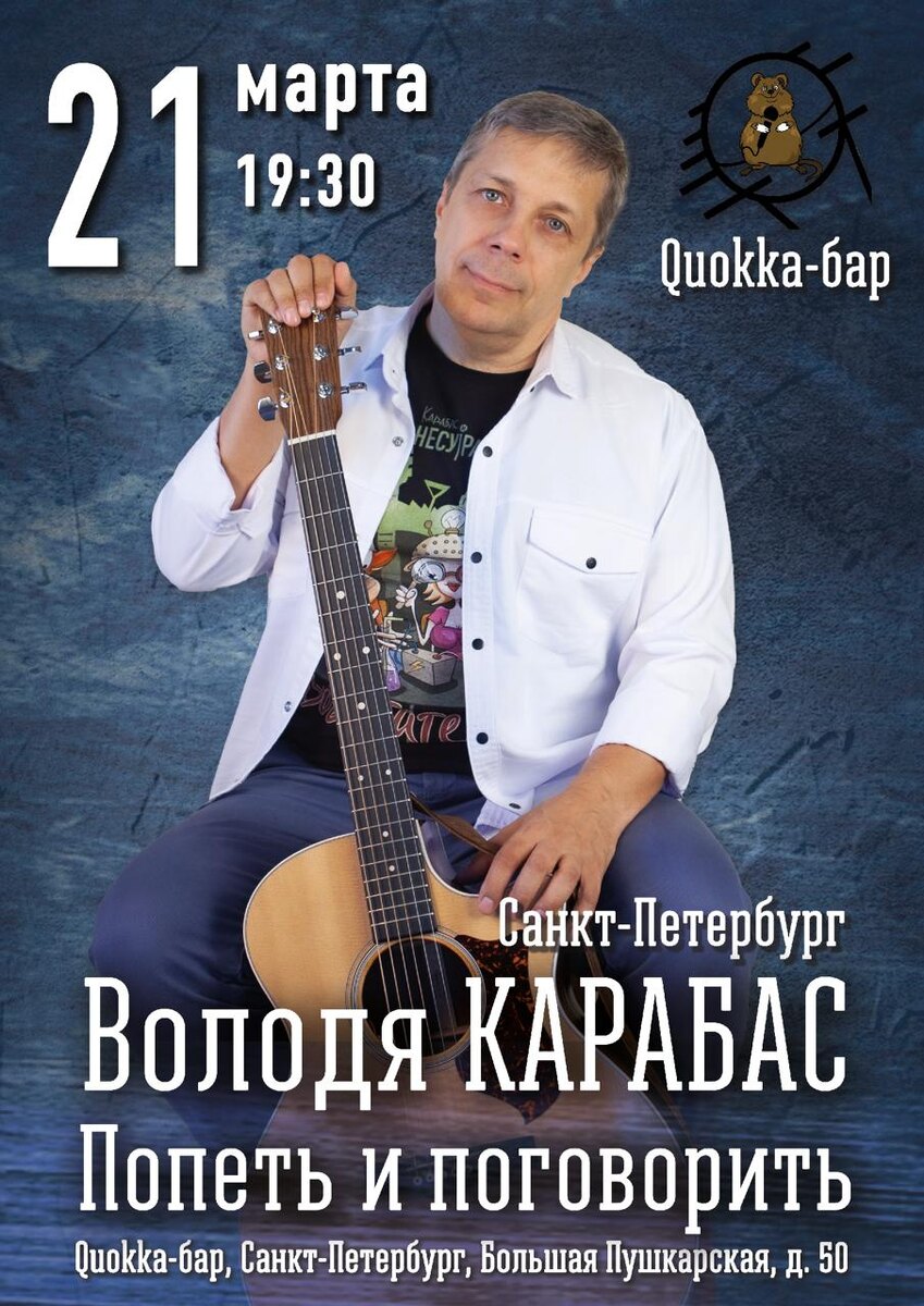 Билеты: http://2103n.ticketscloud.org Quokka bar 19:30 «Володя Карабас: Попеть и поговорить» Небольшой творческий вечер в уютном месте. Непринуждённое общение в домашней атмосфере и песни разных лет и разных проектов. Санкт-Петербург, Большая Пушкарская, д. 50 18+ #несуразности #акустика #санктпетербург