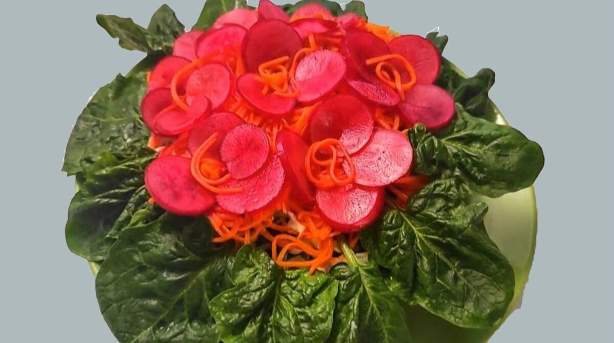 Салат «Фиалка» – идеальный выбор на праздничный стол 8 марта. В нём сочная копченая курица придаёт нежный, но насыщенный вкус, а чернослив добавляет сладковатую кислинку. Цвета салата – ярко‑фиолетовый, который ассоциируется с женственностью и праздником. Готовится салат просто и без варки ингредиентов. Инструменты и посуда: миска, разъемное кулинарное кольцо, нож, доска разделочная, плоское блюдо, ложка. Нарезаю копченый окорочек. Шкурку по желанию можно снять перед нарезкой. Также полосками или как вам угодно нужно нарезать свежий огурец. А чернослив заливаю кипятком и хорошо промываю. Так как обычно в сухофруктах попадаются камешки или остатки косточек. Нарезаю чернослив. И выкладываю в разъемное кольцо: сначала курицу, потом майонезная сетка, далее чернослив и снова майонез. Чтобы салат был не тяжелый на желудок, можно майонез приготовить из аквафабы - жидкости от бобовых. Его можно употреблять в пост и на правильном питании.