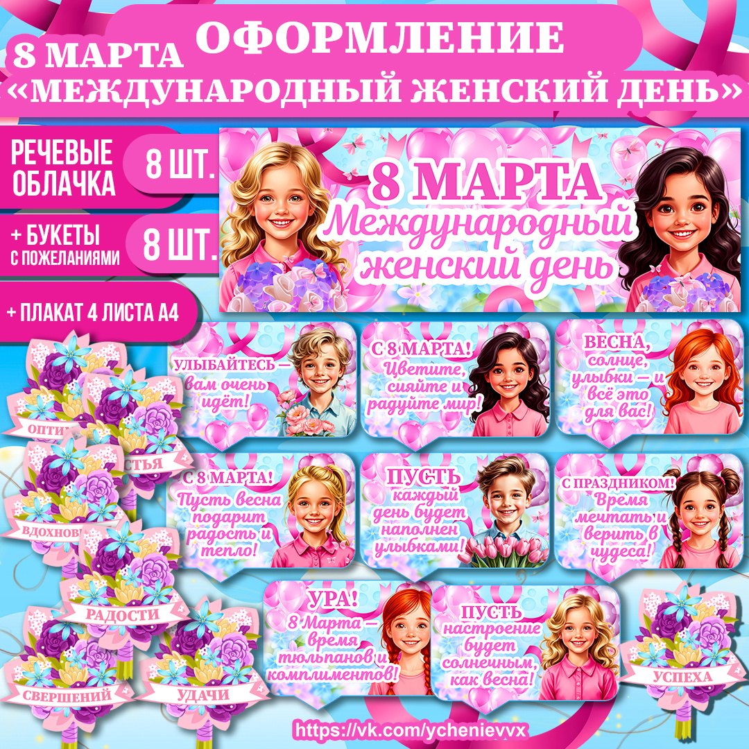 Данный комплект оформления к 8 марта можно скачать здесь. 💐 Создайте весеннее настроение в школе к 8 Марта! Представляю вам комплект оформления для класса, зала, фотозоны, стенда или уголка «Международный женский день». С ним вы легко и быстро украсите пространство и подарите улыбки и тёплые эмоции окружающим.😍 📰 В набор входят 📰 ✅ 8 речевых облачков: 1. Улыбайтесь – вам очень идёт! 2. С 8 Марта! Цветите, сияйте и радуйте мир! 3. Весна, солнце, улыбки — и всё это для вас! 4. С 8 Марта! Пусть весна подарит радость и тепло! 5. Пусть каждый день будет наполнен улыбками! 6. С праздником! Время мечтать и верить в чудеса! 7. Ура! 8 Марта — время тюльпанов и комплиментов! 8. Пусть настроение будет солнечным, как весна! ✅8 букетов цветов для акцентного декора с короткими пожеланиями: 1. Счастья 2. Удачи 3. Здоровья 4. Успеха 5. Радости 6. Свершений 7. Вдохновения 8. Оптимизма ✅ Плакат баннер с надписями «8 марта» и «Международный женский день» (4 листа А4) — заметный и яркий центр композиц