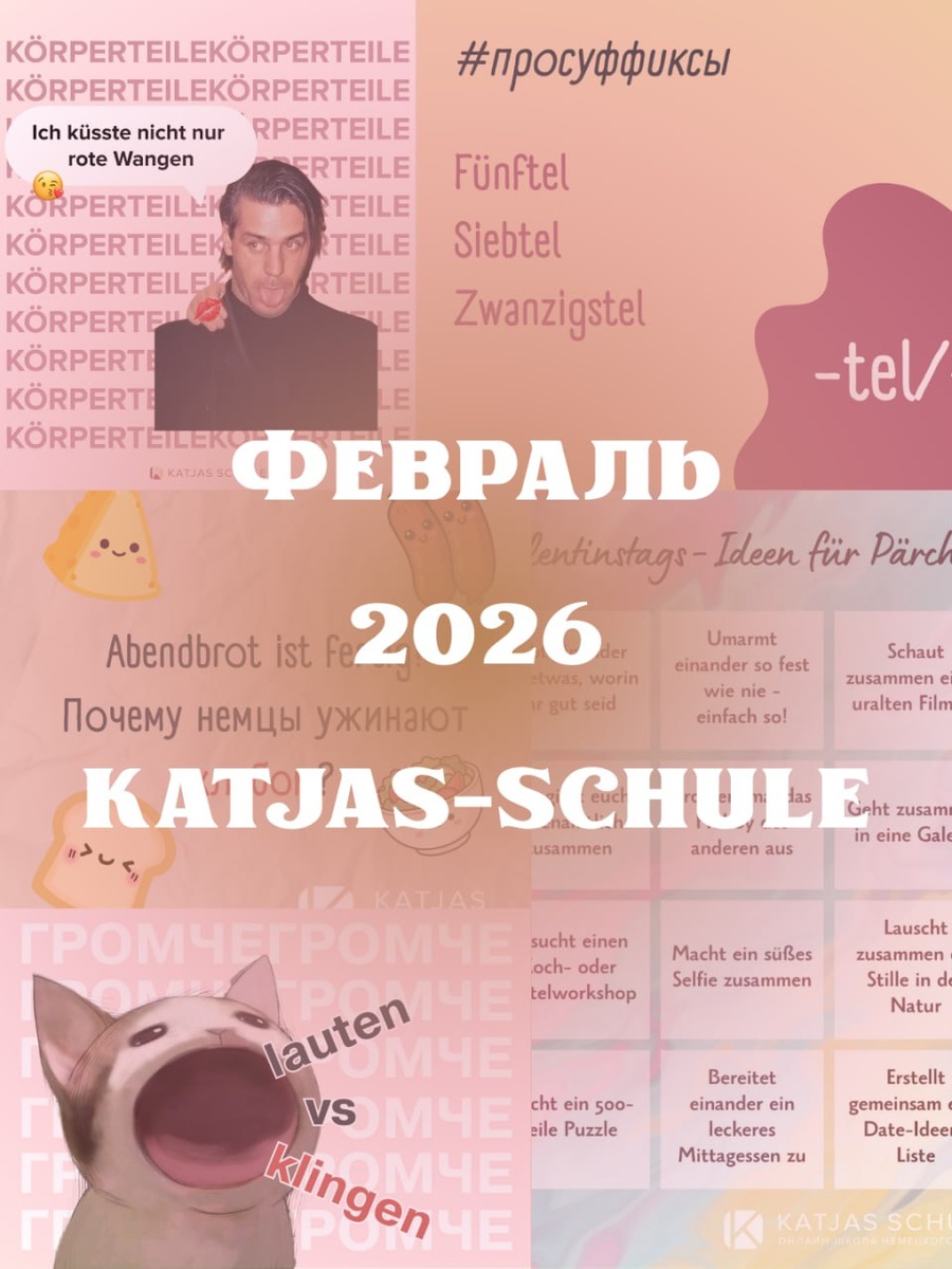 ✉️ Мы в феврале без дела не сидели! Во-первых, запустили набор к нам в группы на изучение немецкого, бегом записываться 🤩 Во-вторых, вон сколько вам всего про немецкий рассказали, смотрите наш #дайджест 🤩 Собираем слова ▫ Без чего не приготовишь Kuchen? ▫ Schafe, schaffen, Schaffner ▫ Когда наступит Jahrhundertwinter? ▫ Украшалово для сумочек ▫ Всякие приколюхи из Японии ▫ Kater подкрался незаметно ▫ Расшифровываем слово Zwischenwasser Исследуем немецкий от головы до пят ▫ В чём разница между lauten и klingen? ▫ Пишем цифры буквами ▫ И делим пироги так, чтобы каждому подписчику досталось по кусочку ▫ Приставку um- в схемах и мемах ▫ Мы победили глагол sich erinnern О Германии чуть дальше банхофа ▫ Azubis, Quereinsteiger – кто это такие? ▫ Зачем кушать хлеб по вечерам ▫ Перемыли косточки Uni-assist в комментариях ▫ Mahlzeit как приветствие ▫ Разыгрываем коллег как настоящие немцы Играем и учимся ▫ Смотрим видео про то, каким должен быть идеальный Partner ▫ Отмечаем Valentinstag с