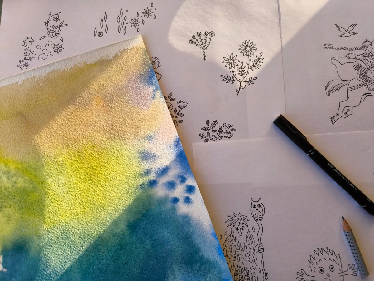 тридевятое царство, почему Царевна-Лягушка сидела на болоте, а потом улетела, когда сожгли ее кожу? Что произошло с ее мужем, когда он пошел ее искать? Кто такой князь Гвидон у Пушкина в сказке о царе Салтане, почему там корабли плавают мимо острова Буяна, и что это за остров такой? Много, много интересного таят в себе сказки, ведь они – наш живой портал в мир предков. Ключ к пониманию себя и своего пути в мире. Мне захотелось сделать какую-то осязаемую вещь, чтобы любой мог окружить себя этим миром чудес, истинной справедливости, сердечной радости и красоты. Так я придумала свою первую в жизни текстильную коллекцию. Легко сказать, придумала. А воплотить как? Во-первых, я нарисовала много рисунков на бумаге. Простой черной ручкой, линнером. Там были деревья русского леса: ели, сосны, дубы, березы, осины, яблони. Там было много цветов. Там были сказочные персонажи. Иван Царевич на Сером Волке, Василиса Прекрасная, Богатырка Синеглазка, Баба-Яга и девочка из сказки Гуси-Лебеди, Кот У