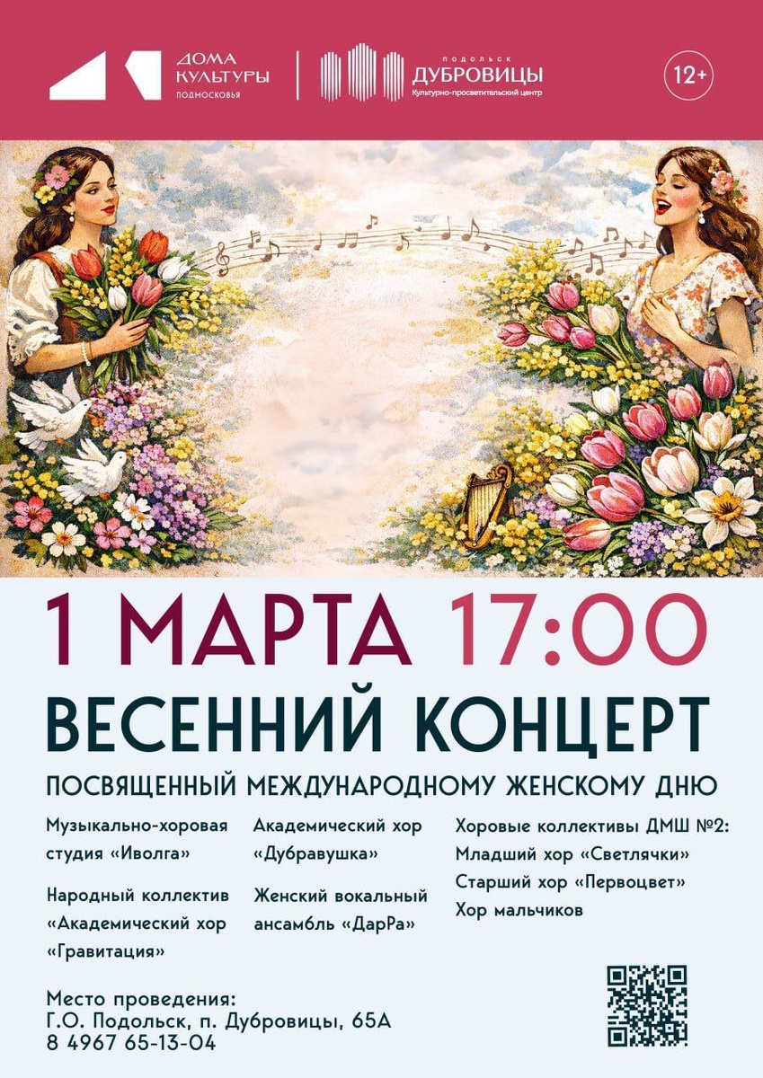 ✨ Весенний концерт, посвященный Международному женскому Дню На сцене выступят 👉Народный коллектив «Академический хор «Гравитация», 👉 Музыкально-хоровая студия «Иволга», 👉 Академический хор «Дубравушка» и Женский вокальный ансамбль «ДарРа», 👉Хоровые коллективы Детской музыкальной школы №2: младший хор «Светлячки», старший хор «Первоцвет», хор мальчиков. ⌛Продолжительность - 1 час 30 минут 🚫 Возраст: 0+ 📆 01.03.2026 🕒 17:00 🏢 Культурно-просветительский центр "Дубровицы" 📍 г.о. Подольск, поселок Дубровицы, д. 65А 💰 Вход свободный❗️ ⭐Поддержать канал голосом 🍰Где поесть в Подольске ✅ Мероприятия Подольск https://dzen.ru/id/66ed500f7b5671493eca3fd6 http://vk.com/podolsk_events http://dzen.ru/podolsk_events
