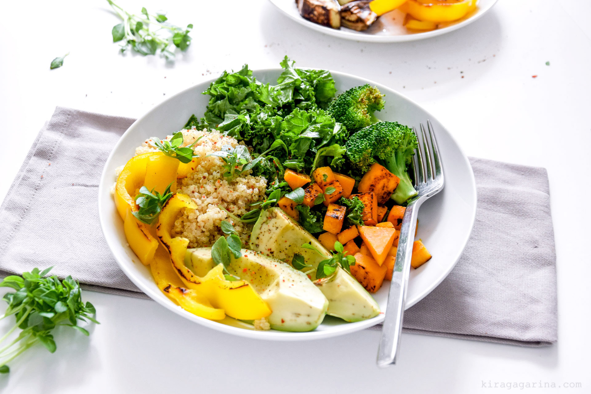 - В боул выложите киноа, свежий шпинат, запечённую тыкву.