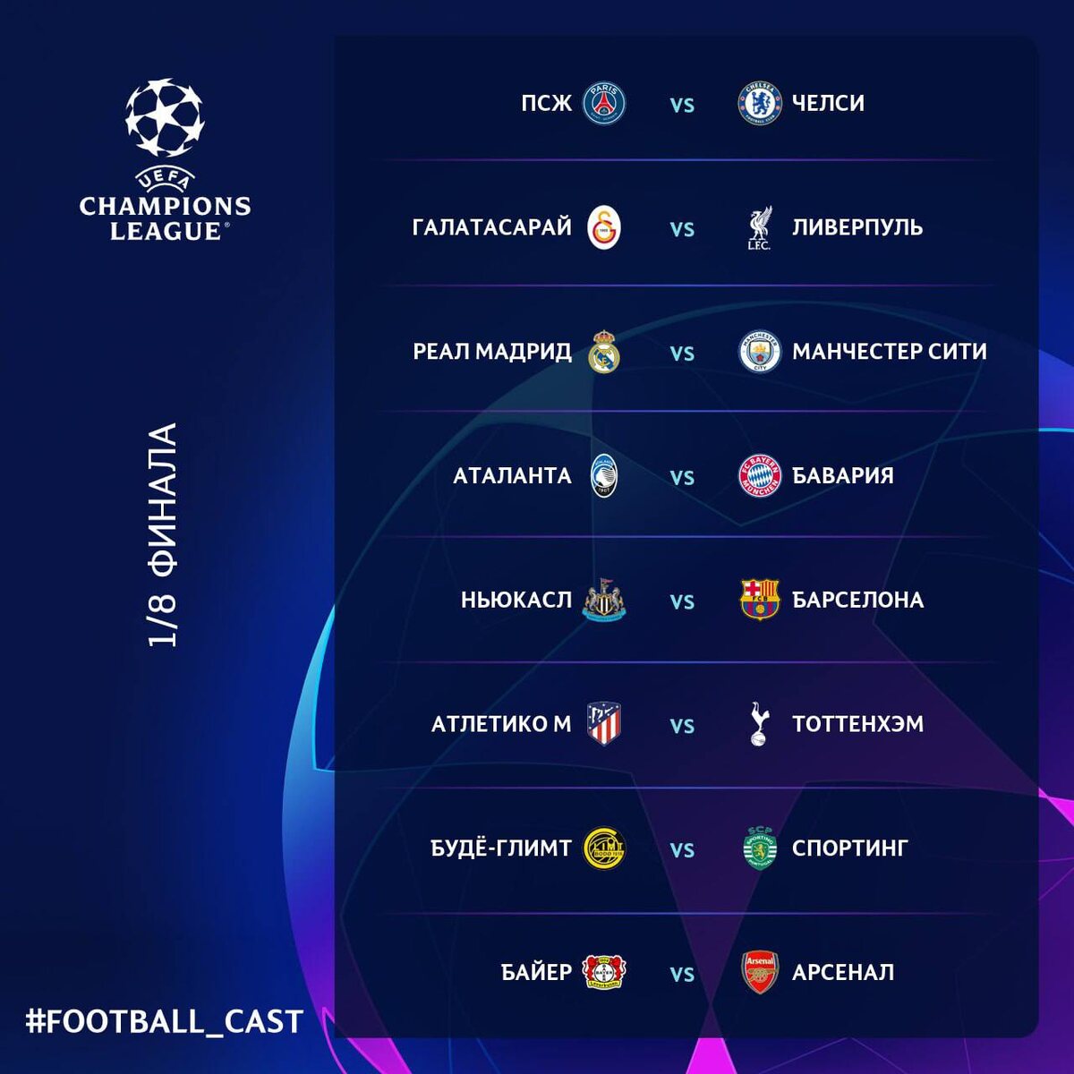 По мнению компьютера Opta, главный фаворит турнира – «Арсенал», но, как говорил Казарцев: «проверим-проверим». «Арсенал» получил довольно «лёгкую часть сетки. Встреча с топовым оппонентом намечается разве что в полуфинале. Кто это может быть? Скорее всего, «Барса», которая должна преодолеть сопротивление «Ньюкасла», а затем повидается и с «Атлетико». Это будет уже после того, как станет ясно, лишат ли мадридцы каталонцев финала Кубка Короля. Если лишат – будет повод поквитаться. В противостоянии «Будё-Глимт» и «Спортинга» отдадим предпочтение норвежцам, но дальше четвертьфинала они не шагнут. Главная пара следующего раунда – уже классическая баталия между «Сити» и «Реалом». Думаем, мадридцы способны шагнуть дальше лишь благодаря 2-м факторам: сольным номерам Винисиуса (а-ля гол «Барсе» в Суперкубке) и отменной игре Куртуа. Даже несовершенный «Сити» сейчас явно сильнее и стабильнее «Реала». Победитель этой пары выходит на «Баварию». Немцы тоже – «тёмная лошадка». Вроде штампуют победы,