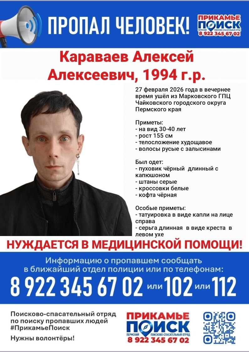 ❗ КАРАВАЕВ АЛЕКСЕЙ АЛЕКСЕЕВИЧ, 1994 г.р. 27 февраля 2026 года в вечернее время ушел из Марковского ГПЦ Чайковского городского округа Пермского края. Если вам что-либо известно о пропавшем, просьба сообщить по телефонам: 8 922 34567 02 или 112 #ПрикамьеПоиск #poisk342 #Пермь #Чайковский