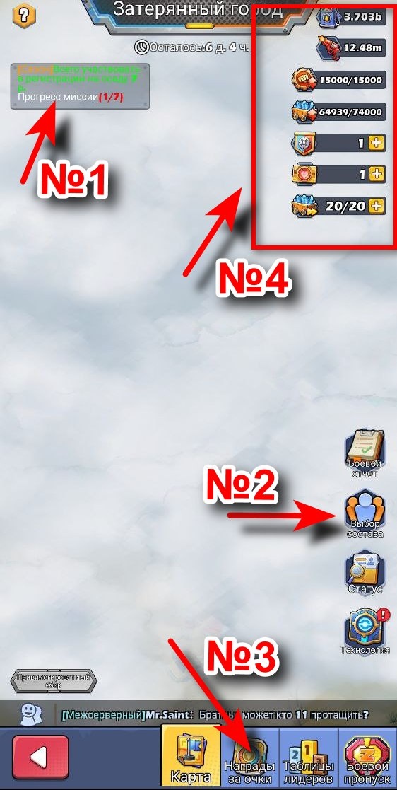 В первый и второй день игры центр карты покрыт туманом войны и для сбора доступны только простые шахты. На шахту можно одновременно поставить 4 героя одной гильдии. Собирать можно как у своей гильдии, так и у чужой. Объём ресурсов на каждой 30000. За собранные ресурсы вы получаете 10% личных очков. Когда шахта иссякла, или героя на шахте убили, необходимо поставить его на сбор снова, пока не будет собран дневной лимит. То есть для успешного сбора и накопления личных очков, и прокачки всей гильдии, желательно периодически заглядывать в игру, чем чаще, тем лучше! Подсказка что герой не собирает ресурсы видна на главном экране, в виде восклицательного знака на иконке "Затерянный город". Хотя игра с глюками, может и не показывать, чаще проверяйте!