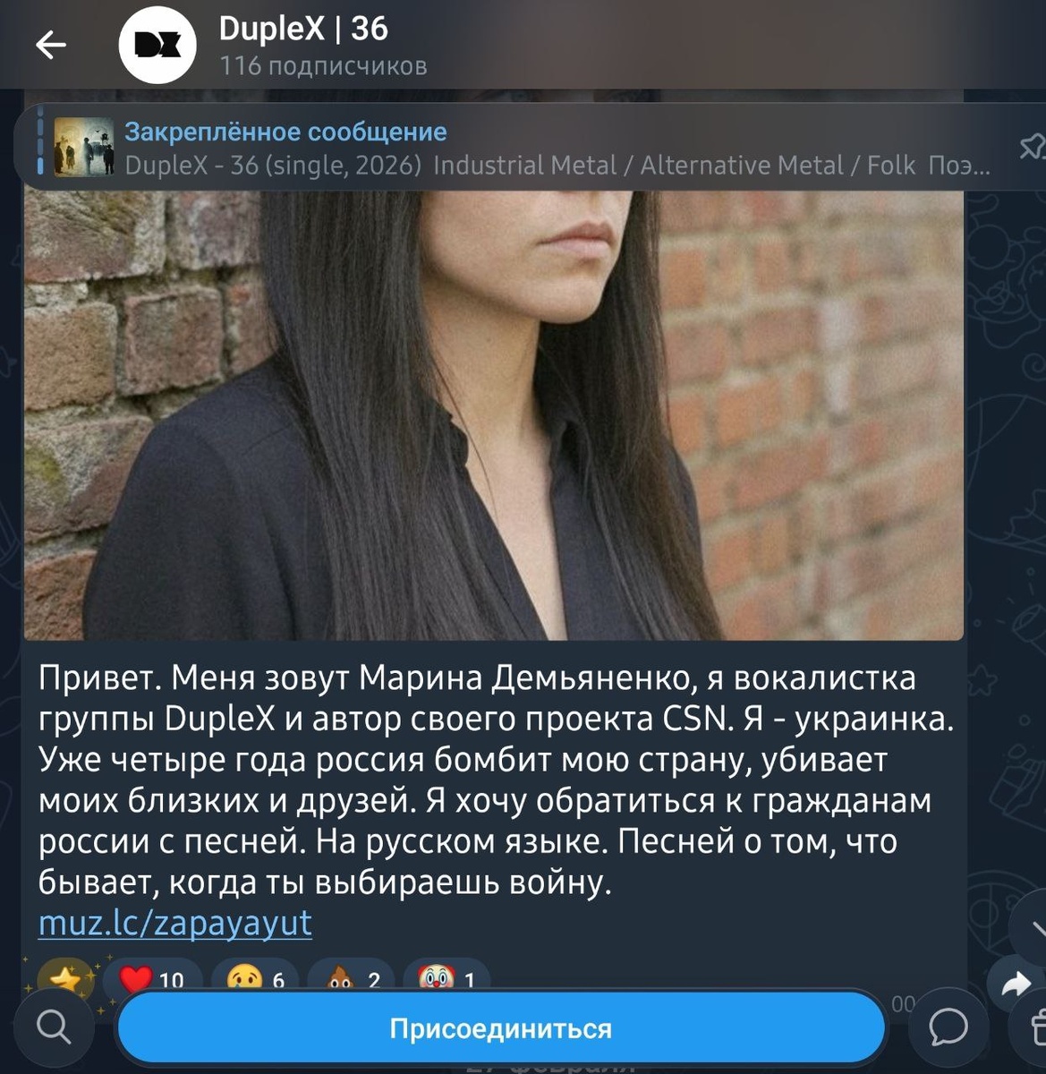 ! На платформе размещена песня русофобки о убитом русском солдате, которую спела солистка группы Duplex, в презентации песни она пишет: Меня зовут Марина Демьяненко, я вокалистка группы DupleХ. Я - украинка. Уже четыре года Россия бомбит мою страну, убивает моих близких и друзей. Я хочу обратиться к гражданам России с песней. На русском языке. Песней о том, что бывает, когда ты выбираешь войну. (Россию она пишет с маленькой буквы). Вот строки из песни: Снаряд пролетел быстро Расквасил твою морду - Передал привет от министра.. Все мозги разбросало рядом Все что было в тебе человечным Разметало одним снарядом.. Интересно, чью башку тебе пришьют к телу.. В тесный ящик запаяют твои кости.. Песня прошла модерацию на Яндекс музыке, а сама группа спокойно собирает донаты, которые скорее всего используются для финансирование ВСУ. Как? Как такое возможно на отечественной платформе? И там ведь не только эти треки.. Талипов Телеграм https://dzen.ru/id/62bd3a507a2e4f0f3b546b33 МАХ max