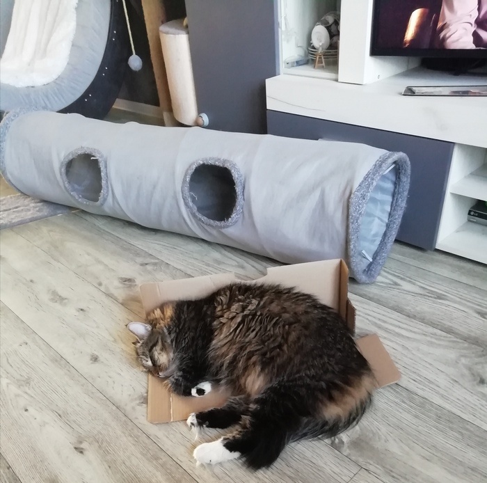 Я вот не понимаю логику этих пушистых жёпок. Три гамака мягких, очень мягких. Три матраса очень мягких, специально подобранных под параметры каждой попы. Два дивана кошачьих - прямо сам бы спал. Домики-фигомики, да в конце концов кресло качалка с пушистым пледом и хозяйские диваны-кровати и прочие удобства. Но блин, стоит занести в дом коробку, они начинают воевать за право спать на ней. На этот раз победу одержала вот эта Елизавета. И ведь неудобно, время от времени со вздохом переворачивается с одного бока на другой, но не уйдёт. Дурни как есть. Пост автора sluchainyprohozi. Читать комментарии на Пикабу.