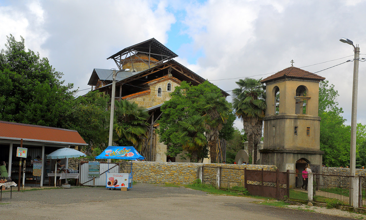 Расставшись с дождливым озером Рица https://dzen.ru/a/aaGcsFA2yEqXd8ON мы переехали в селение Лыхны известное храмом Пресвятой Богородицы строительство которого датируется X - XI веком. Пересказывать рассказ гида я не буду (тем более, что с момента экскурсии прошло почти 9 лет), а дам ссылку на историю храма https://www.tourister.ru/world/europe/abkhazija/city/likhni/temples/26060?ysclid=mm6eqqvmgv210840622 и предоставлю возможность "поговорить" фотокамере. Должен сказать, что в 2017-м году храм пытались реставрировать. Закончили ли они этот процесс за 9 лет - ??? Кстати, в VI веке Лыхны были столицей Абхазии. И в селении сохранились развалины летнего дворца абхазских князей датируемый X веком. Недалеко от храма и дворца находился небольшой рынок, на котором мы приобрели бутылку местного домашнего полусладкого вина "Лыхны". Кстати, вино с таким названием уже не домашнего изготовления продается и в магазинах. Не могу сказать, что недомашнее сильно отличается от домашнего. Я не бол