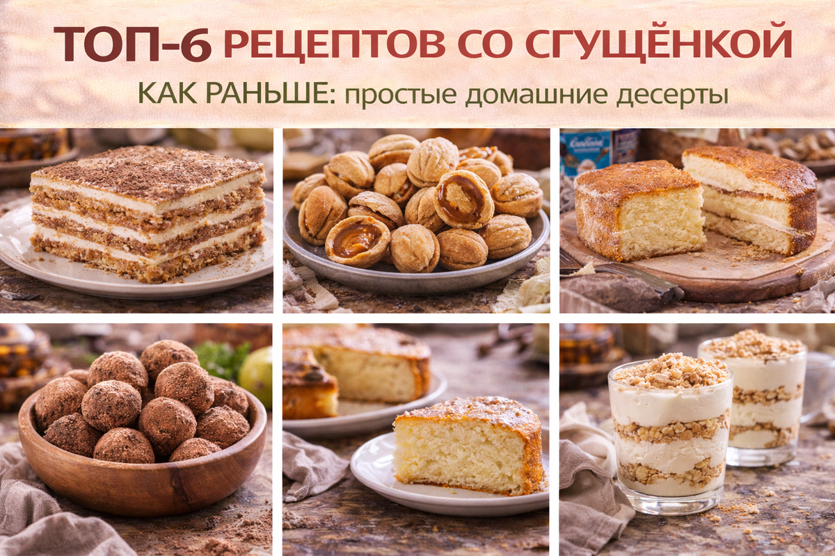 Сгущёнка долгое время была настоящим домашним сокровищем. Банку открывали не каждый день, а для особого случая. Её добавляли в кремы, выпечку и даже просто намазывали на хлеб к чаю. Простые рецепты со сгущёнкой ценились за одно качество — они почти всегда получались. Ниже шесть проверенных вариантов с подробным приготовлением. Ингредиенты: Приготовление: Готовность: печенье становится мягким и режется как торт. Ингредиенты: Приготовление: Смешай варёную сгущёнку с мягким маслом до густого крема. Наполни половинки орешков и соединяй их попарно. Через 1 час крем стабилизируется. Ингредиенты: Приготовление: Ингредиенты: Приготовление: Ингредиенты: Приготовление: Признак готовности — золотистый верх и сухая шпажка. Ингредиенты: Приготовление: Сгущёнка остаётся одним из самых простых продуктов для домашней выпечки, потому что сама создаёт вкус и текстуру без сложных действий.