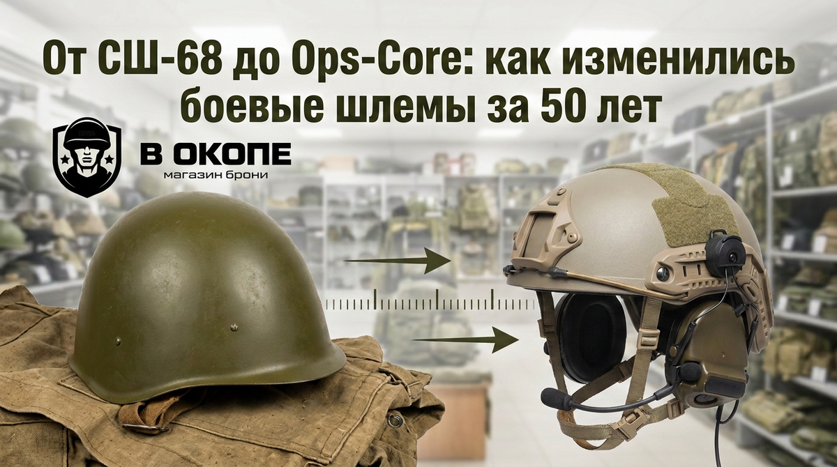От СШ-68 до современных композитных шлемов — путь в полвека. Сталь уступила место арамиду и полиэтилену. Примитивный подтулейник — регулируемым подвескам. Голая каска — платформе для электроники.