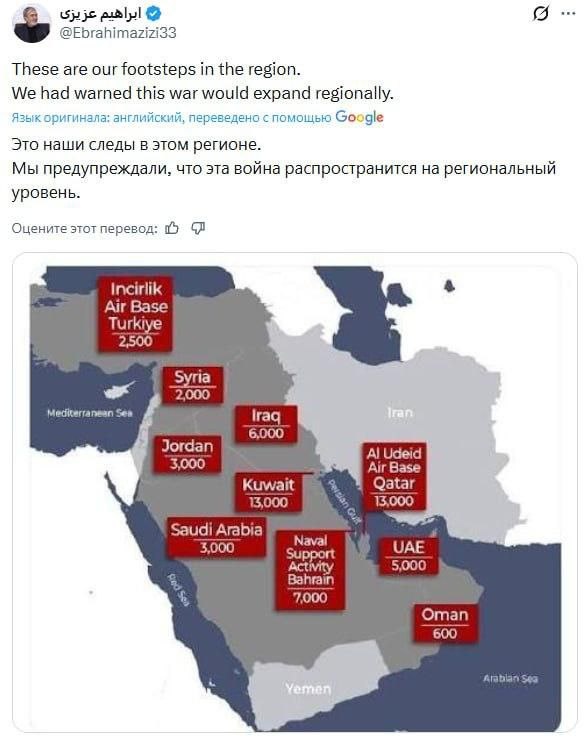Председатель комитета нацбезопасности парламента Ирана опубликовал карту с военными базами США на Ближнем Востоке.