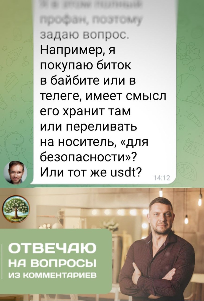 🙌 ❓ Вопрос: «Например, я покупаю биток в Bybit или в телеге, имеет смысл его хранить там или переливать на носитель "для безопасности"? Или тот же USDT?» 📍 Мой ответ: всё зависит от вашего горизонта Здесь нет единственно правильного решения. Есть только ваш сценарий. 🔹 Сценарий 1. Вы ждёте ближайший буллран (3–5 лет) Вы купили, планируете дождаться роста, продать и выйти в фиат 🎯 👉 Храните там, где купили. Никакого смысла переводить нет. Только лишние комиссии и лишние телодвижения 🔄 И Telegram-кошельки, и Bybit на горизонте 3–5 лет — условно надёжны. При текущих условиях. Дождётесь события, продадите, заработаете, выйдете в фиат 💵 🔹 Сценарий 2. Вы играете в «длинную» с верой в светлое будущее Вы хотите, чтобы внуки были богатыми благодаря вашему битку 👨👩👧👦✨ Тут горизонт — неопределённо далёкий. 15–20 лет, а то и больше ⏳ За это время с Telegram-кошельком и даже с Bybit может случиться всё что угодно. Банкротство, блокировки, смена политики ⚠️ 👉 Лучше выве