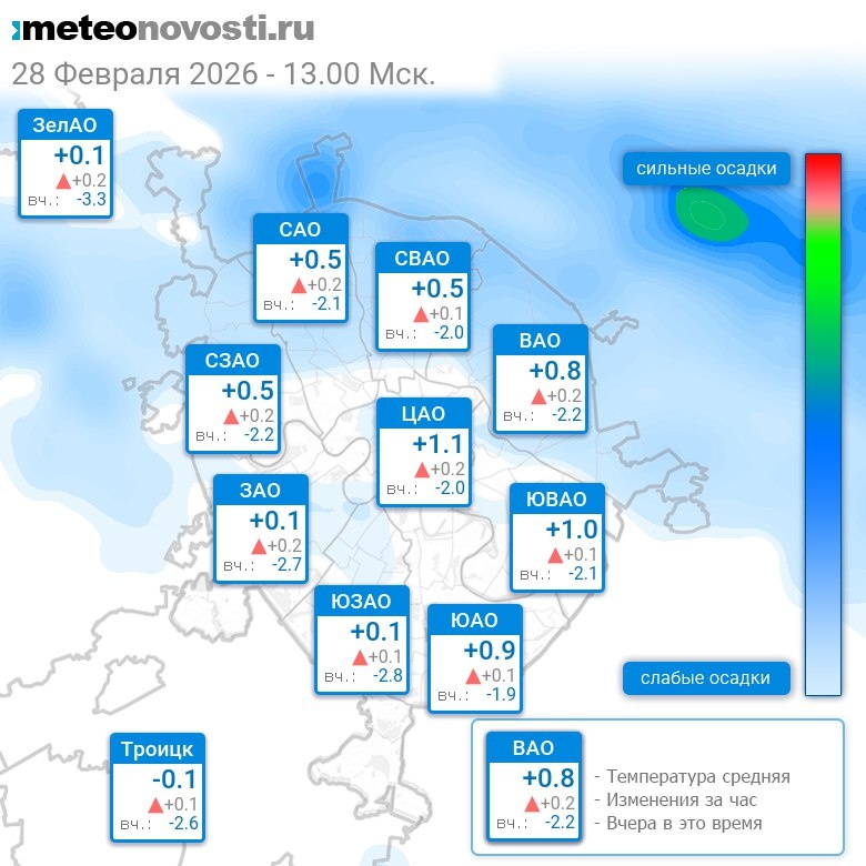 В 13:00 в Москве было от -0.1°C до +1.8°C, средняя температура +0.7°C #погода #Москва #зима #температура #28февраля #суббота