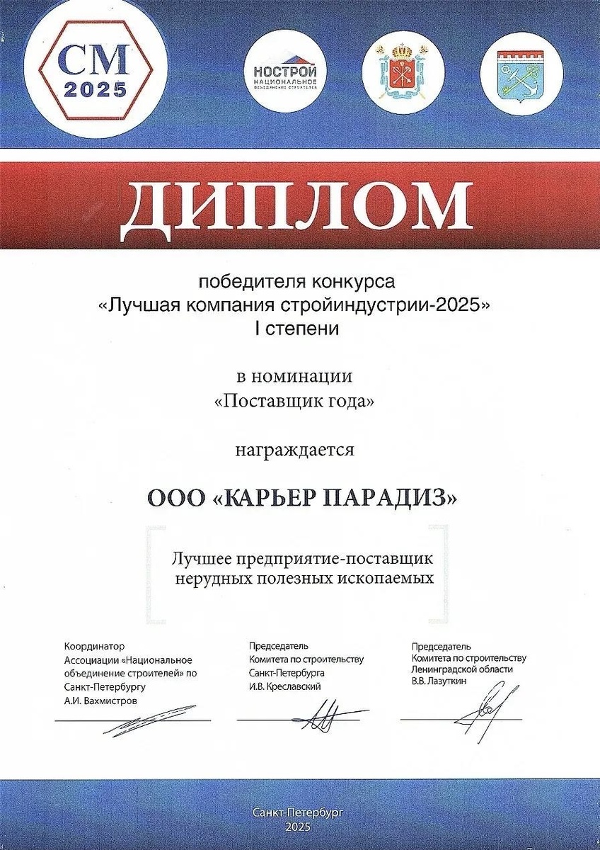 По итогам 2025 года компания «Карьер Парадиз» признана лучшим поставщиком в сфере нерудных материалов. Награждение состоялось при участии Комитета по строительству Санкт-Петербурга. Данный статус подтверждает высокий уровень операционной эффективности компании и её соответствие требованиям строительного комплекса региона. Решение о присвоении звания было принято на основании комплексной оценки деятельности поставщиков, работающих на территории Санкт-Петербурга и Ленинградской области. Экспертная комиссия учитывала: