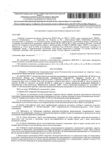 м, кадастровый номер 31:05:0522011:40. Имущество обременено: арест, запрещение регистрации. Имущество принадлежит на праве собственности Сергееву М.А. Основание реализации: постановление о передаче арестованного имущества на торги от 05.02.2026 № 31003/26/284954 Борисовского РОСП Канал: Госземля Республика Адыгея Область: обл Белгородская Старооскольский р-н Район: СТ «Дубрава» Населенный пункт: участок № 294 Локация: Смотреть на карте ВРИ: Садоводство Кадастровый номер: 1:05:0522011:40 Кадастровая стоимость: - Вид сделки: Продажа Площадь: 397 м² Начальная цена: 38000.00 руб. Дата завершения: 02.04.2026 Подробнее: ГИС ТОРГИ #госземля #земляотгосударства #земля #земельныйучасток #земельныеторги #торги #аукцион #продажаземли #продажа #республикаадыгея