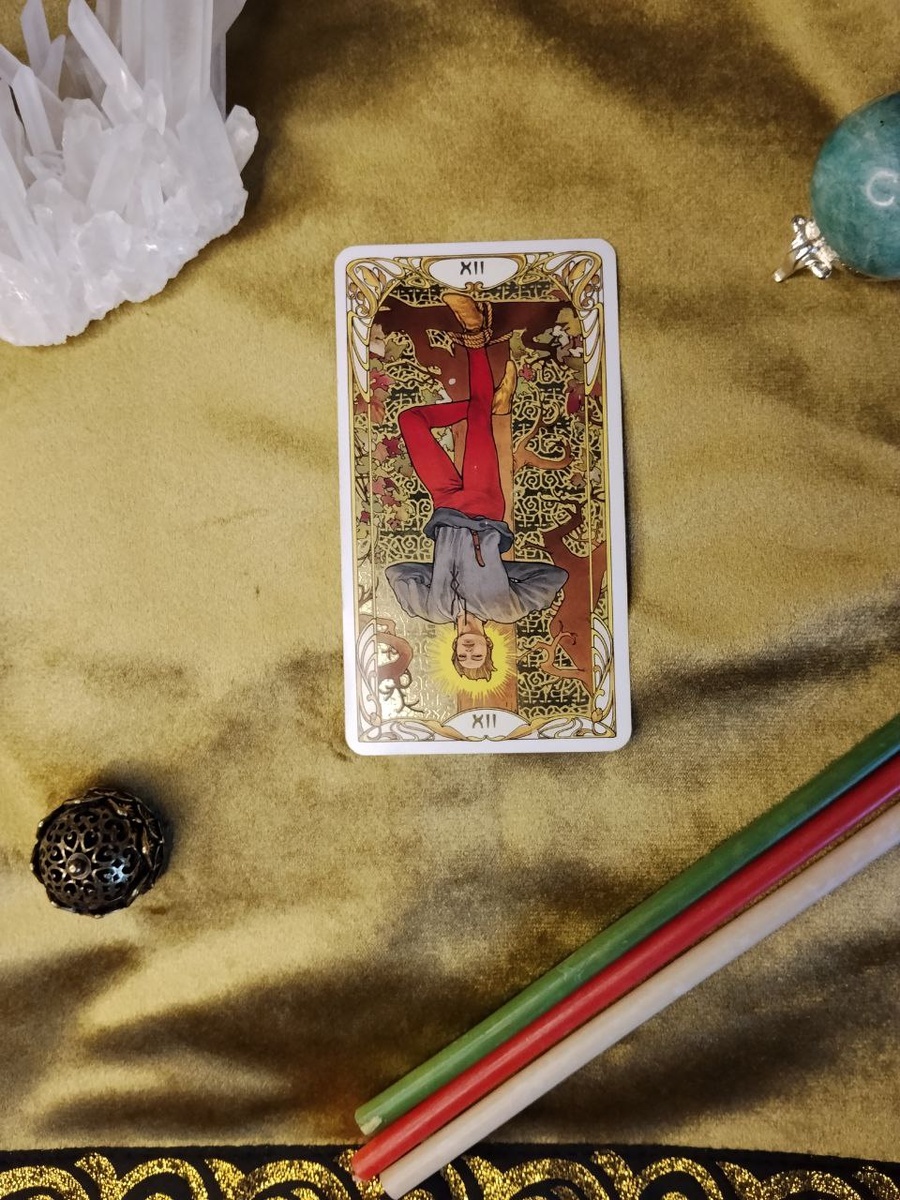 Планета - Нептун. Планета иллюзий. Скандинавский бог Один провисел девять дней на мировом дереве Игдрассиль, обрёл мудрость и руны. Ощущение, что застряли и не можете выбраться. Как будто всё остановилось, не продвигается. Карта говорит: не торопись, осмысли. Жертвенность. Пожертвовать меньшим ради высшего. Духовные практики, поиск новых систем ценностей. Совет: иногда стоит поискать ответ внутри себя. Иногда предупреждает об опасности. Иногда, чтобы человек подумал и помучился. Болезненный компромисс. По минусу: напрасная жертвенность, застой, депрессия, лень. Вынужденные поездки по решению зависших вопросов. Оттягивание решений. Пассивный день. Занятие медитацией