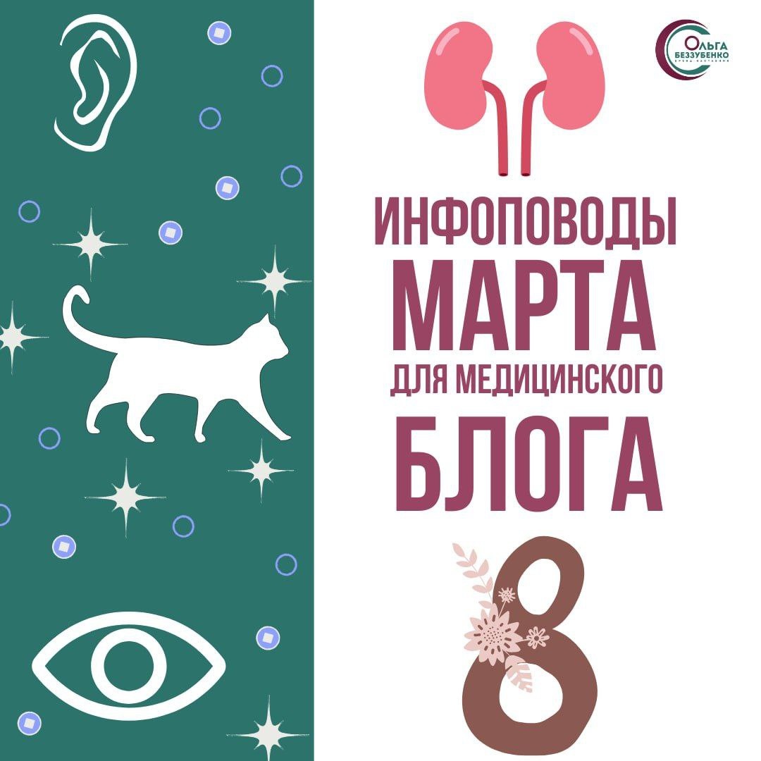 ! Перезимовали! Ура! Вот мартовские #инфоповод_дня 💚1 марта Всемирный день иммунитета Всемирный день комплимента День кошек в России Праздник прихода весны 💚2 марта Всемирный день большого тенниса Всемирный день психического здоровья подростков 💚3 марта Международный день охраны здоровья уха и слуха Всемирный день писателя День вкусного завтрака Всемирный день предотвращения врождённых пороков развития 💚4 марта Всемирный день борьбы с ожирением Международный день осведомлённости о вирусе папилломы человека Международный день очкарика 💚6 марта Международный день зубного врача Всемирный день борьбы с глаукомой Всероссийский день гурмана 💚8 марта 8 Марта (Международный женский день) 💚9 марта День шоколадного торта День нестандартно мыслящих людей 💚10 марта День диетолога Международный день лайма 💚11 марта День пандемии коронавируса 💚12 марта Всемирный день почки Всемирный день ананаса Всемирная неделя знаний о мозге 💚13 марта Всемирный день сна День сомнолога День о