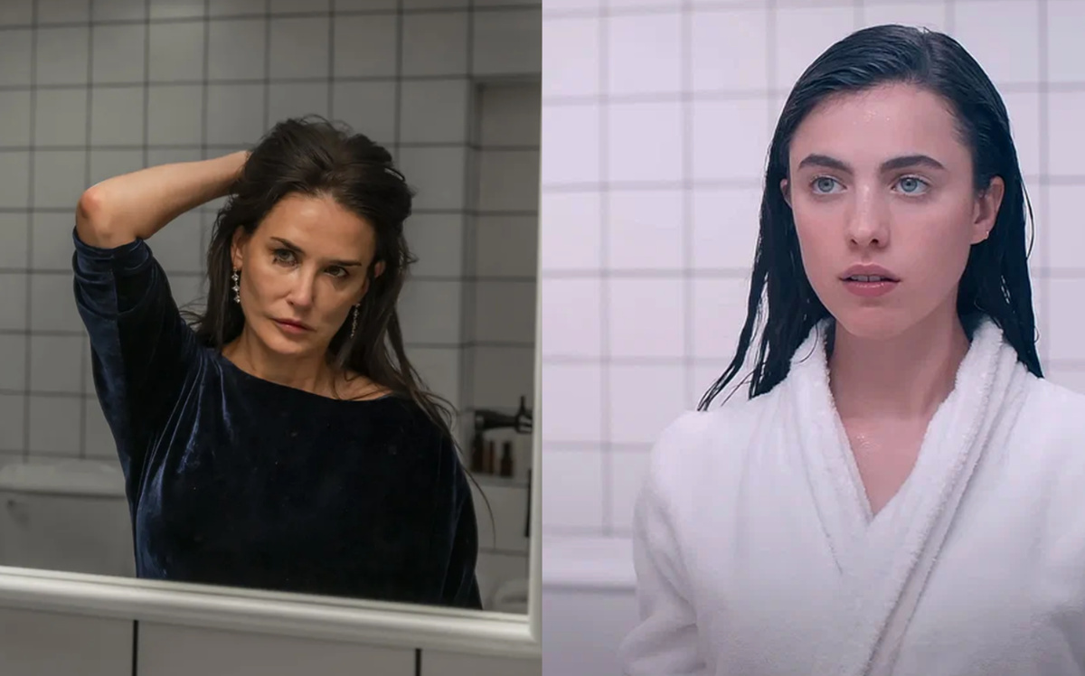 Фильмы подобного жанра не входят в список горячо любимых мной, но в "Субстанции" настолько хорошо проиллюстрировано расщепление личности, что я как специалист получила огромное удовольствие от данной метафоры. В результате травмирующей ситуации (увольнение под предлогом возраста, говоря языком сленга - эйджизм) личность главной героини расщепляется на выживающую (молодая и привлекательная девушка Сью) и травмированную (героиня Деми Мур) части, которые сосуществуют внутри психики и демонстрируют противоречивые реакции и модели поведения. По сюжету расщепление происходит под воздействием особого вещества "Субстанция". В обычной жизни для расщепления ничего принимать не обязательно (разве что желаемое за действительное). Желание героини (на фото слева) вернуть былую славу приводит к расколу на две части, которым требуется появляться в порядке очереди. При этом каждая из них питается за счёт ресурса другой: молодая - за счёт физического тела, зрелая - за счёт эмоциональных инвестиций в дру