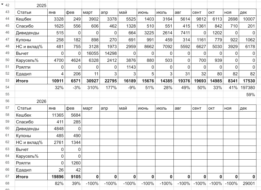 Февраль, как всегда, месяц не особо жирный в этом плане, но получила на почти 40% больше, чем в феврале 2025.
