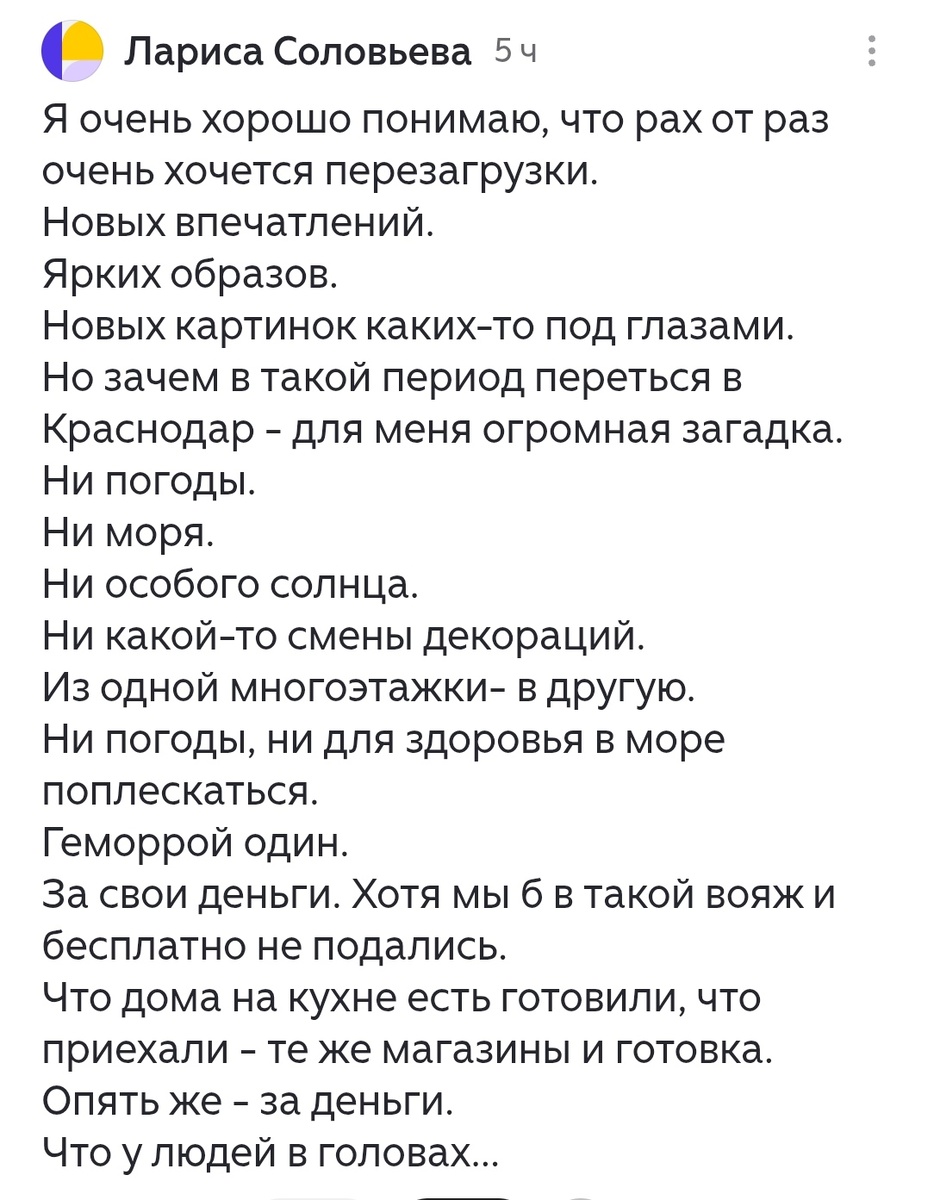Лариса Соловьева, видимо, может позволить себе дорогие путешествия и обладает крепким здоровьем, позволяющим ей ездить на море летом. Это замечательно, но не всем так повезло.