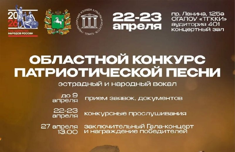 В апреле 2026 года Томский Губернаторский колледж культуры и искусств примет участников Областного конкурса патриотической песни. В 2026 году департамент по культуре Томской области проводит мероприятие, приуроченное к Году единства народов России. Ежегодный конкурс творчества ставит своей целью сохранение и приумножение лучших традиций патриотической песни, а также выявление и поощрение одаренных музыкантов региона. К состязанию допускаются сольные исполнители и вокальные коллективы, которые могут продемонстрировать свое мастерство в двух направлениях: народное и эстрадное пение. Для каждого направления установлены разделы «солист» и «ансамбль». Фото: департамент по культуре Томской области 🤩Новости Сибири | Прислать новость 💜 Мы в MAX