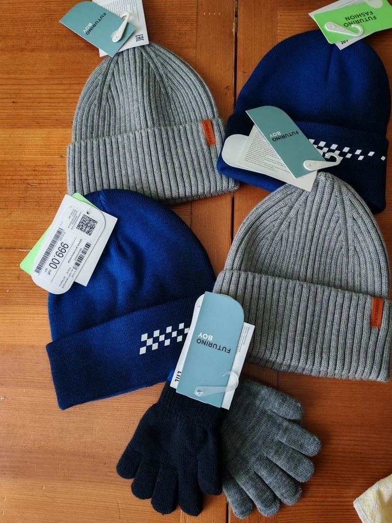 В пятницу я отработала в первую смену и поехала в Детский мир за заказом. Акция была 5=3. Я взяла мальчишкам четыре шапочки и набор перчаток.