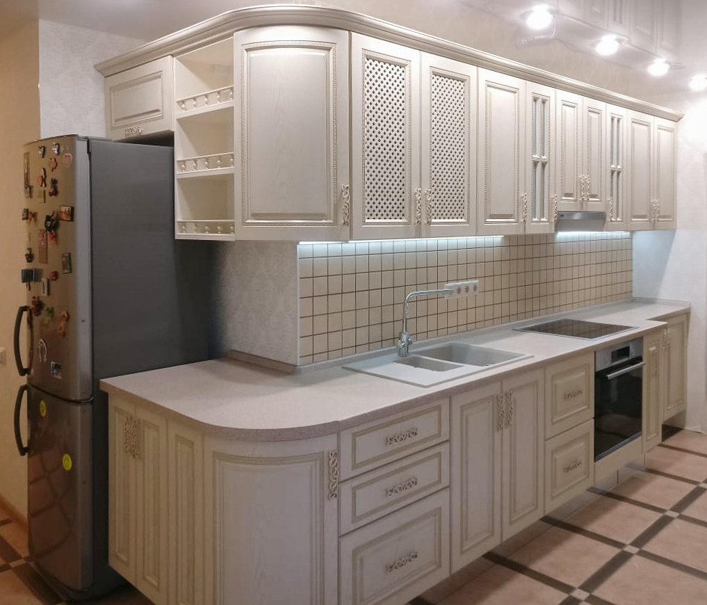 Детали нашей работы: ▪️ Фрезеровка: «Греция» ▪️ Покрытие: ПВХ с золотой патиной ▪️ Элементы: декоративные решетки, карниз, балюстрады Резные филёнки и золотистая патина создают богатый классический образ. Решётчатые дверцы и стеклянные вставки добавляют кухне воздушности, а тёплый молочно-кремовый оттенок наполняет пространство уютом. Интересует кухня в классическом стиле? Изготовим фасады и декоративные элементы! 📍г. Москва, ул. Кантемировская 65, 1 этаж, офис 1 📞 +79777990029 - Антон ✉️ baudexm5@gmail.com 📞 +79015533395 - Кирилл ✉️ baudexm3@gmail.com #проект #Греция #ПВХ #патина #витрина #карниз #декоративнаярешетка #балюстрада