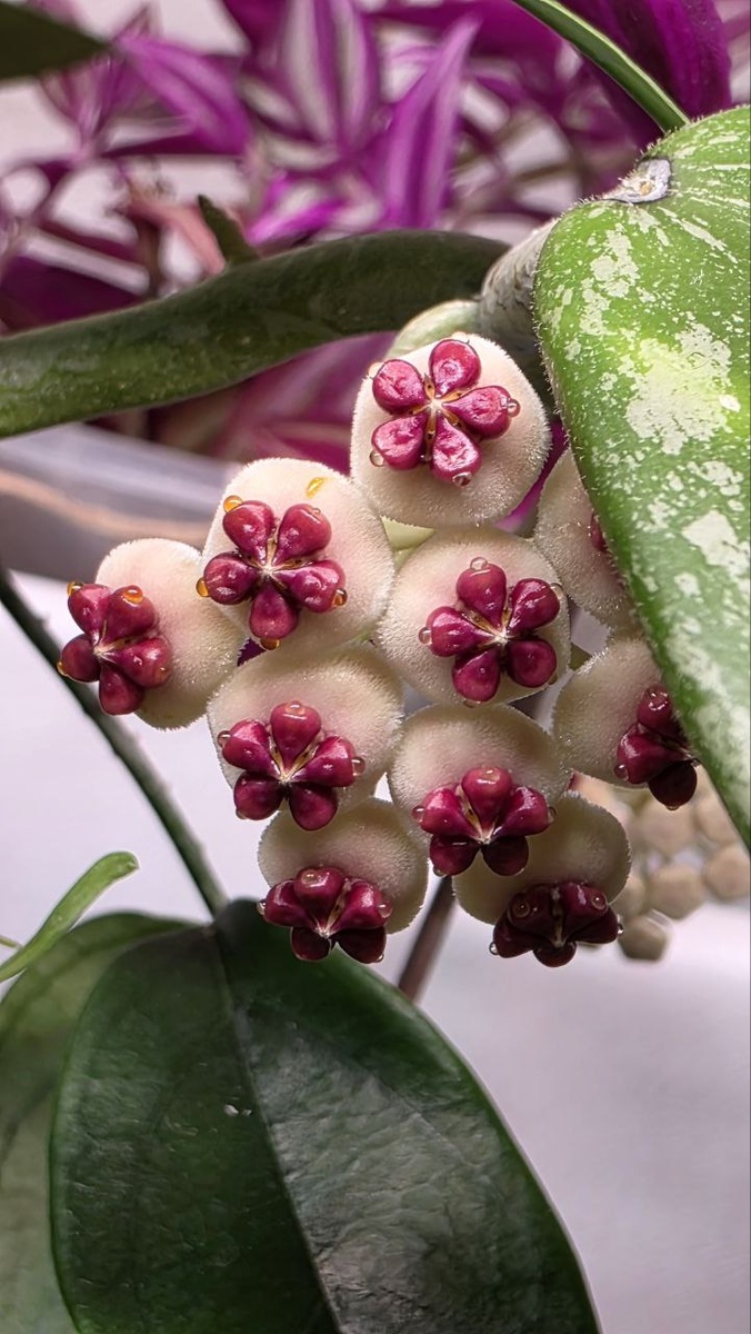 Заинька Керри получает заслуженное ГранПри в номинации "Количество цветоносов в первом цветении", обойдя даже Тсанги, которая в первом цветении выдала три и держала год пальму первенства. Наваять, вытащить и распустить целых пять цветоносов - это вам не хухры-мухры, это целое ого-го и иго-го! Когда спрашивают почему все так весело и дружно цветет, я всегда отвечаю "возраст и сорт", потому что закладка цветения была под вполне себе обычным светом, им просто по возрасту и здоровью было уже пора... НО здесь однозначно скажу "Свет". Это единственная хойя, которая вот так явно среагировала на перестановку под нормальную лампу. сначала она на голых палках попыталась изобразить листья (частично вышло), потом она начала их растить и сразу выдавать цветоносы. Так что да, здесь именно свет. От грунта уж точно это все не зависело, потому что посадка 2024 года, соответственно, древняя, и я не помню что внутри, корней в ней особо не видно, хотя и прозрачный стакан 350мл. Надо вытащить - разобрат