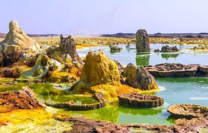 Расположенная на 100-150 метров ниже уровня моря в Афарской котловине, на стыке трех разломов, где расходятся литосферные плиты, Данакильская впадина образует причудливый, фантастический желто-зеленый ландшафт, нетипичный для нашей планеты. Здесь во многих местах словно из-под земли вырастают конусы, щиты, прорываются шипящие гейзеры и горячие источники, в углублениях разливаются разноцветные озера с едкой кислотой и шлейфами горячего пара.