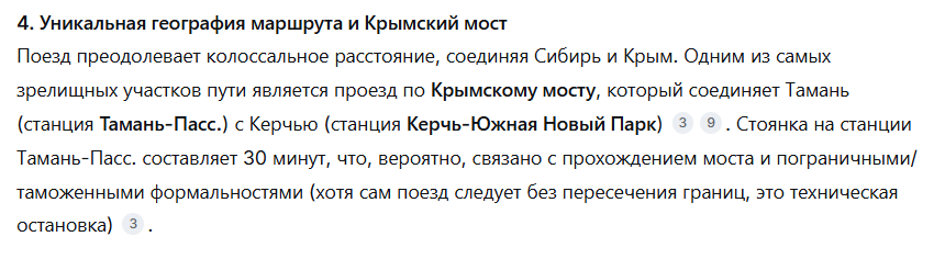 Этот маршрут испортили всем, чем только можно. Длительной стоянкой в Екатеринбурге, обилием технических остановок на 2,5-3 часа, и, наконец, отправлением из Симферополя в 2 часа ночи. Последнее ну уж совсем ни в какие ворота не лезет. Это ж до какой степени нужно не любить туристов, чтобы такое придумать. Причем, приходит он в Симферополь во вполне комфортные для человеческого разворота 16:00, но его вот прямо затягивают зачем-то. Причем, вскоре после Джанкоя поезд тормозят на техническую остановку на станции Кировская на 58 минут. Ну затормозили бы на 2 часа 58 минут, но отправили из Симферополя в удобоваримое время. Штрафы же за технические остановки - и за их количество, и за их продолжительность. В результате, медленный маршрут в Крым получает лишь 4 балла из 10 возможных, а вот обратно - 5 баллов из 10. Он там немного пошустрее. Протяженность же маршрута по данным wikiroutes у него снизилась на 15 км. Но для общей протяженности 4219 км - это терпимо, конечно. А вот DeepSeek прид