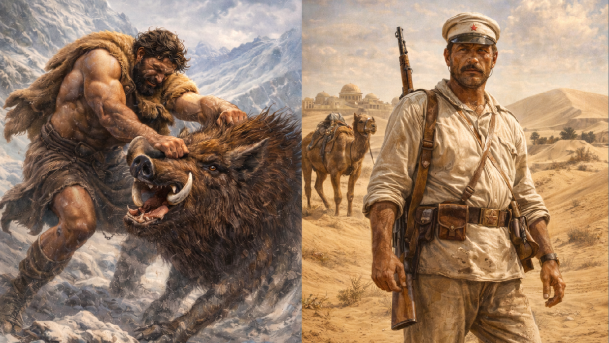 Геракл не идёт “в лоб”, не играет в яростную победу. Он делает умнее и холоднее: загоняет вепря туда, где бешеная энергия вязнет — в снег, в тяжёлую среду, где зверь теряет скорость.