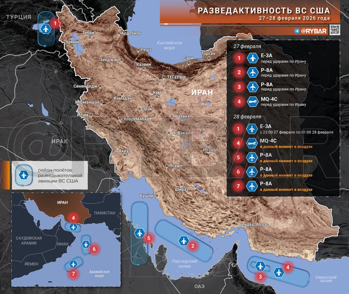 📝 золотое правило любой операции Отголоски лета прошлого года наблюдались и перед новой войной. За пару недель до сегодняшней эскалации американцы последовательно проводили разведку иранской территрории. ➡️26 и 27 февраля у иранских границ фиксировалось не менее 4 самолетов и беспилотников. Над персидским заливом действовал самолет Р-8А на направлении Бушера, Ассилуйе и Бендер-Аббаса, который попали под удар. ➡️Над Оманским заливом функционировал еще один Р-8А и стратегический БЛА MQ-4C, которые вели разведку за Чахбахаром и Конараком, которые также подверглись налетам американцев и израильтян. ➡️А над Турцией уже несколько дней подряд в ночное время летал самолет дальнего радиолокационного обнаружения Е-3А ОВВС НАТО, который выискивал системы ПВО на северо-западе Ирана, который также подвергся атакам. 🖍А в ночь прямо перед начавшейся операций Е-3А снова около 2 часов полетал у границ с Ираном, и на утро американцы приступили к нанесению ударов. Прямо перед этим в воздух были по
