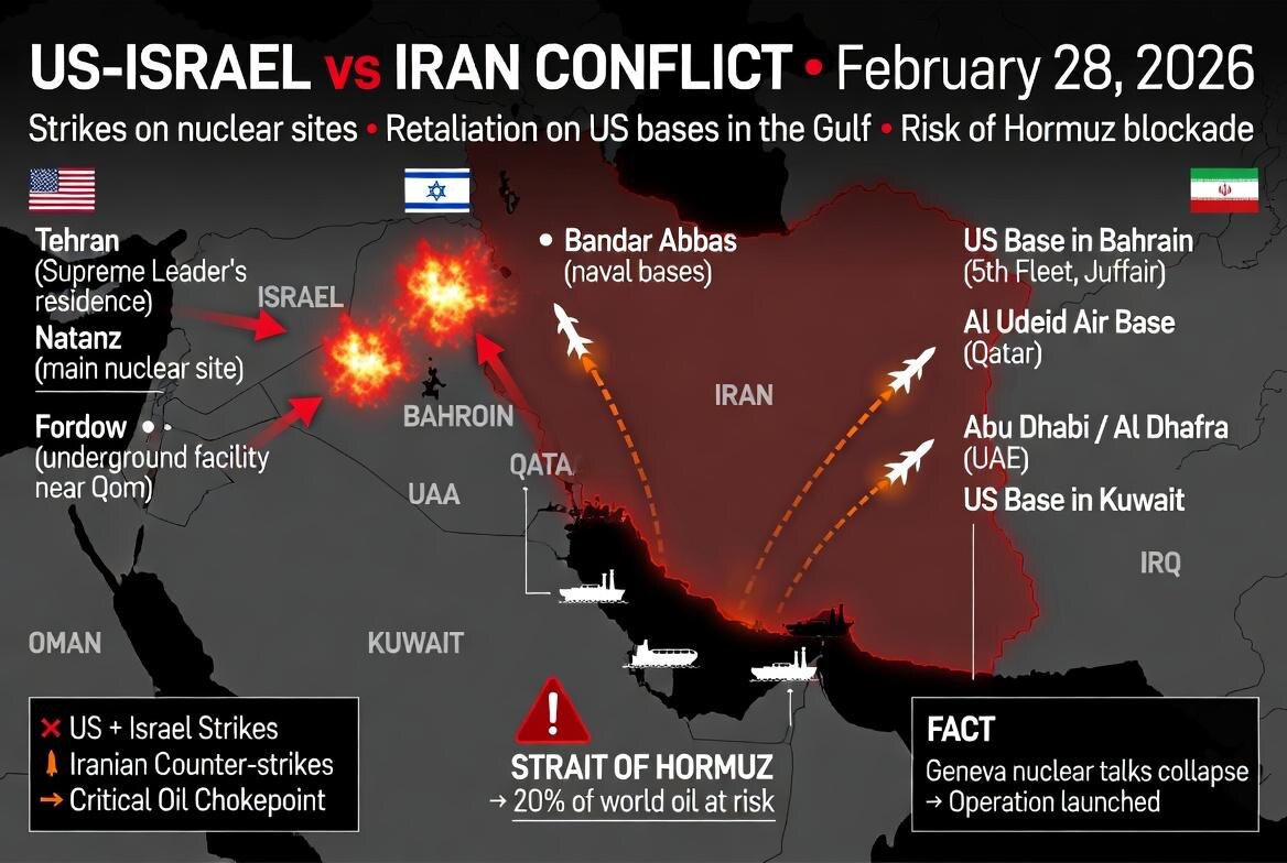 🟠 Оранжевые ракеты — ответ Ирана ⚠️ Ормузский пролив — главная нефтяная «горячая точка» Анализ Grok: Влияние конфликта США-Израиль vs Иран на рынки (28 февраля 2026, прогноз 2 недели) Нефть Brent: +10–25 % ($82–105+) Акции: S&P 500 / Nasdaq –4…–9 %; оборонка + энергетика +10–18 % Золото: +7–14 % (новые максимумы) Доллар (DXY): +2–4 % Волатильность: VIX 30–45 Криптовалюты Bitcoin & Ethereum: –8…–15 % в первые 3–5 дней (risk-off, корреляция с Nasdaq) Затем возможный отскок +5…+12 % (как «цифровое золото») Общий крипто-рынок: капитализация –10…–20 % на старте В плюсе: BTC/ETH как хедж; в минусе — альткоины и DeFi Сценарии (вероятность) Умеренная эскалация (Ормуз открыт): 60 % → нефть +15 %, акции –6 %, BTC –10 % → +7 % Быстрое затихание: 25 % → рынки восстанавливаются +2…+5 % Серьёзная эскалация (угроза пролива): 12 % → нефть +30 %, акции –12…–18 %, BTC –20 % Полномасштабная война: 3 % → нефть $140+, глобальная распродажа Главный триггер — Ормузский пролив. #Grok #US #Israel