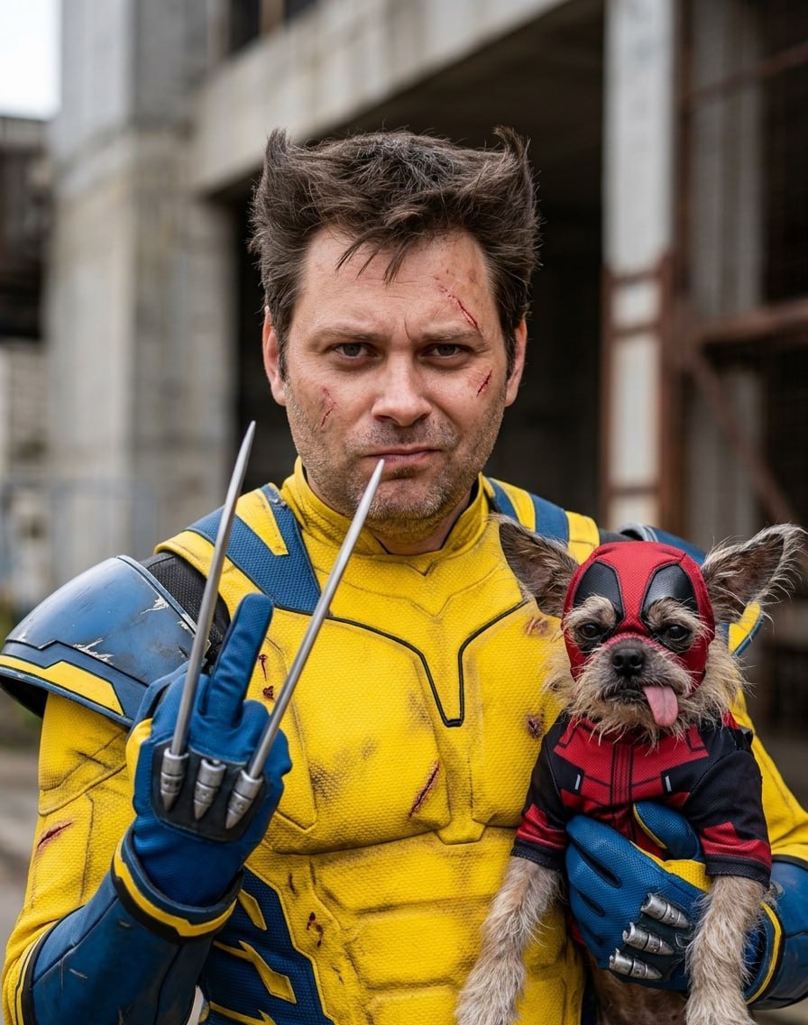 По просьбе подписчика, прикрепляете свое фото и становитесь супергероем. перенеси черты лица человека с загруженных фотографий максимально точно, сохранив его внешность, мимику и индивидуальные особенности. мужчина европейской внешности с прической росомахи из фильма одет в жёлто-синий костюм с защитными элементами, стилизованный под костюм росомахи. он держит на руках маленькую собаку породы мопса и китайской хохлатой собаки, одетую в костюм в стиле дэдпула. язык собаки высунут, она выглядит комично. мужчина показывает средний палец в виде лезвия выходящего из руки выражение лица — лёгкое раздражение, но в глазах читается юмор. взгляд направлен прямо в камеру. композиция крупная, акцент на деталях костюмов и выражениях лиц. мужчина расположен чуть выше центра кадра. фон слегка размыт, с намёком на индустриальное окружение. освещение естественное, с акцентом на лице и костюме. атмосфера юмористическая и пародийная. ключевой контраст — брутальный образ мужчины и смешной костюм со