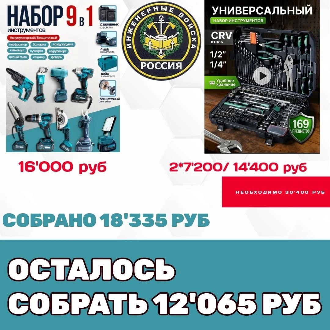 Парням очень она нужна. Продолжаем сбор для инженерно-саперного батальона на: 1. Набор инструментов 9 в 1 - 16'000 руб. 2. Универсальный набор инструментов - 2 шт. - 14'400 руб. 🚩Сумма к сбору - 30'400 руб. 🔺Собрано - 18'335 руб. 🔺Осталось собрать - 12'065 руб. Любую посильную сумму можно перевести на номер карты 💳2202208188194204 или по номеру телефона 📞+79530562233 Получатель - Светлана Владимировна Л. ("Сбербанк") ❤️Спасибо большое вам за поддержку! #уралсвоихнебросает #помощьраненым #медицинскаяпомощь #вместемысправимся