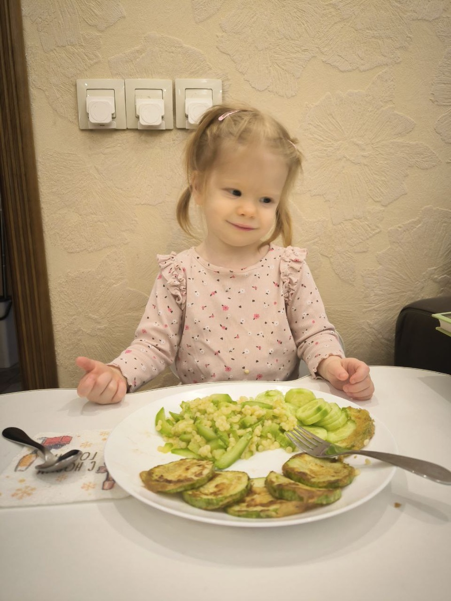 Тейкины предпочтения в еде постепенно меняются, сейчас уже она полюбила огурцы) А вообще её любимая еда это поразительно правильные и полезные продукты - брокколи, свежий зелёный горошек, брюссельская капуста, 🥕 морковь и почти все фрукты👌