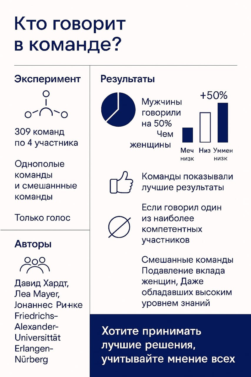 Исследование показало: даже в нейтральных условиях, без камер и визуальных подсказок, мужчины говорят больше, чем женщины - и это влияет на эффективность команд. 🧪 Эксперимент: ▪️1 236 участников, распределены по 309 команд (по 4 человека). ▪️Форматы: мужские, женские и смешанные. ▪️Общение - только голосом, задача - коллективное решение. ▪️Участники не знали друг друга, не видели и не слышали голосов заранее. 📊 Результаты: 🔹В смешанных командах мужчины говорили на 50% больше, чем женщины. 🔹Мужчины с высоким уровнем навыков говорили больше всех. 🔹Мужчины с низким уровнем - вторые по активности. 🔹Женщины с высоким уровнем говорили меньше, чем даже мужчины с низким. 🔹Женщины с низким уровнем - наименее активные участники. 🔹В мужских командах среднее количество реплик - на 20% выше, чем в женских. 🔹Команды, где говорили наиболее компетентные участники, показывали лучшие результаты. 🔹В смешанных группах женский вклад часто недооценивался - несмотря на высокий уровень навыков. 🧠