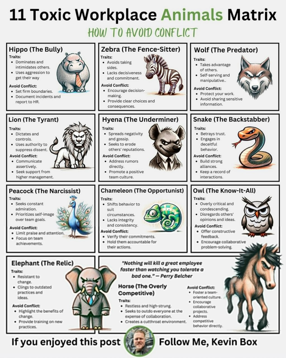 Матрица токсичных животных: 11 типов коллег, которые разрушают команду (и как с ними работать)