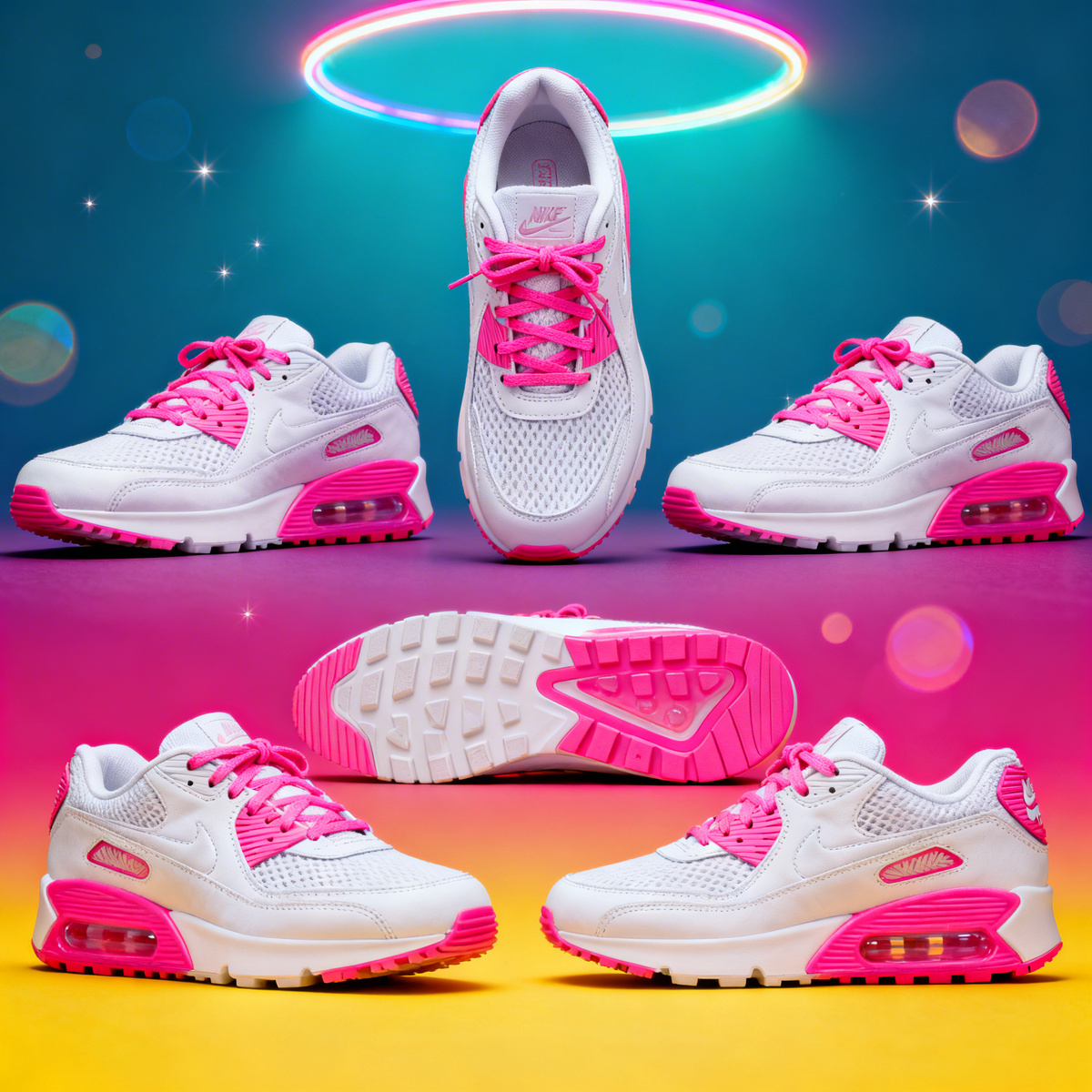 Ultra-detailed premium e-commerce product collage photography of a pair of modern white women's sneakers with vibrant neon pink accents, featuring breathable white mesh upper panels with subtle perforation patterns, smooth matte white synthetic leather overlays on toe cap and heel, thick padded collar with neon pink interior lining, bright neon pink flat laces with metal aglets, matching neon pink midsole with visible air cushioning units and glossy reflective finish, white rubber outsole with multi-directional deep tread pattern and neon pink accent lines, small metallic silver branding logo on tongue and heel tab, placed on clean elevated white minimalist rectangular pedestal, arranged in a perfectly symmetrical and balanced collage layout on one frame: left side profile view, right side profile view, straight front view, straight back view, and large centered bottom sole view clearly showing full tread pattern and air cushioning, sharp impeccable focus on every detail, extreme macro-level texture visibility including individual mesh threads, precise stitching, lace holes, rubber grip pattern and glossy midsole reflections, symmetrical luxury composition, high-end commercial online store aesthetic, shot on professional DSLR 100mm macro lens, soft even diffused studio lighting combined with colorful neon rim lighting and gentle reflections on glossy surfaces, photorealistic materials and textures with natural depth, 8K ultra-high resolution, vibrant colorful gradient background smoothly transitioning from soft cyan to hot magenta to bright sunny yellow with subtle glowing bokeh orbs and very light floating sparkles, no shadows on background, no extra objects, no people, no hands, completely isolated product presentation, dynamic energetic modern luxury vibe, --ar 3:2 --v 7 --stylize 75 --q 2 --style raw