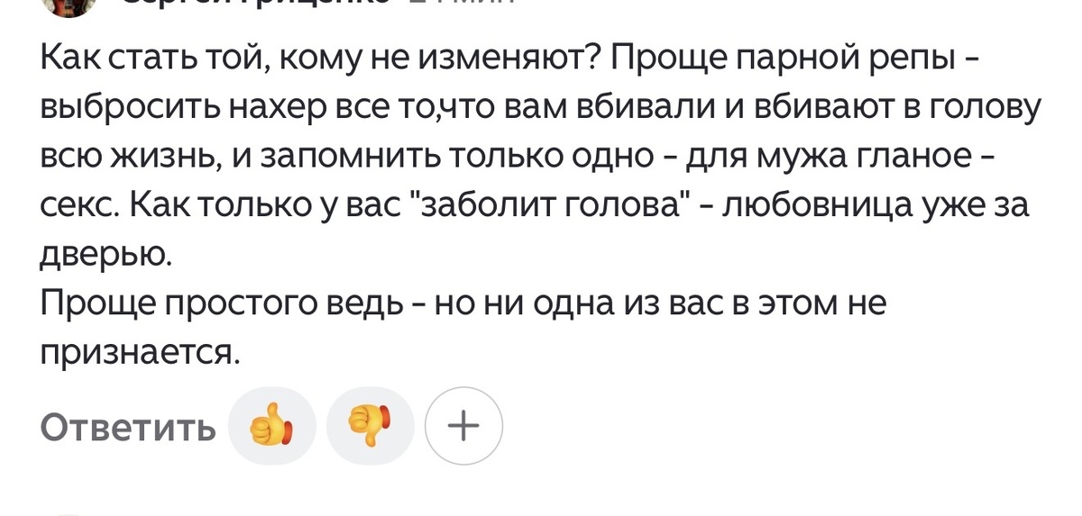 А у тебя болит голова? Открыли мне тут в комментариях супер-секрет для женщин, как сделать так, чтобы мужья не изменяли. Со скрином можно ознакомиться ниже, оригинальная лексика сохранена, заранее прошу прощения.