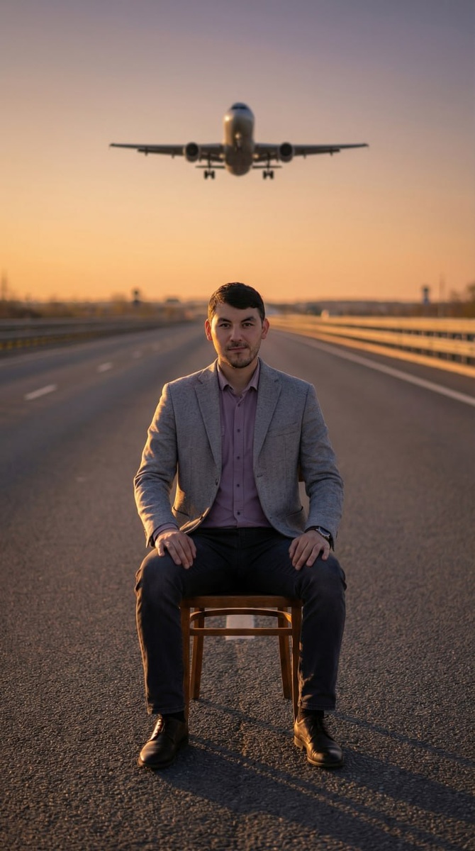 Qo‘llanma: 1️⃣ Flow ni oching Nano Banana Pro modelini tanlang 🤖 O‘zingizning rasmingizni yuklang Va quyidagi promptni kiriting: Use my uploaded photo as a reference for my face and personality. Keep the face realistic and consistent. A cinematically realistic photograph of the same person sitting on a simple wooden chair in the middle of an empty three-lane highway (MKAD). A perfectly centered composition, full-length shot, camera positioned low and directly in front of the person, with a symmetrical perspective. A large passenger jet flies in the sky far behind and above the person, centered on the road but at a realistic distance, appearing small and not too close. Positioned just above the person's head. The plane should appear to be flying in the background, maintaining a natural perspective and scale, slightly blurred by the distance. Sunset lighting at golden hour, soft, warm natural light, cinematic shadows, an ultra-realistic photograph. Mood: calm, confident, cinematic