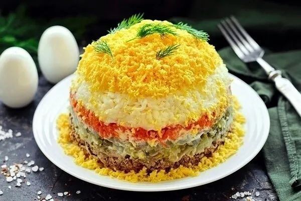 Хороший салат на праздничный стол, получается вкусным и сытным, выглядит очень эффектно! При этом продукты для его приготовления нужны самые простые и бюджетные. Если подготовите ингредиенты заранее (отварите яйца, печень и морковь; поджарите лук, то собрать блюдо можно очень быстро). Будет идеально, если ещё сделать домашний майонез, но это уже по желанию хозяйки.
