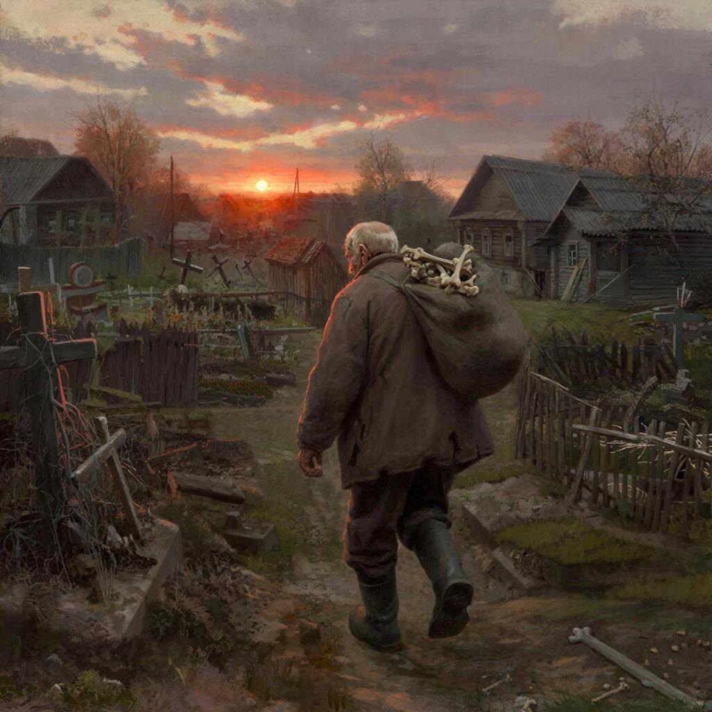 Жизнь после шестидесяти пяти походила на вытоптанное поле: привычный уклад крошился, как сухая глина, а улыбка, некогда широкая и добродушная, укрывалась за беззубым провалом. Врачи разводили руками, но Сергей Иванович, воспитанный землей, знал: все тайны – в ней же. «Первое сокровище для остова – кальций, – рассудил он, – а кладезь его не в аптечных склянках, а в прахе предков». Работа копальщиком могил из необходимости превратилась в миссию. Пока другие, роя новую яму, с глухим стуком сбрасывали обнажившиеся кости прежних жильцов в темноту, он совершал свой тихий обряд. Костяшки, ребра, тазовые чаши – все аккуратно складывалось в мешок. «Самое ценное – челюсти с зубами, – вспоминал он позже, держа в мозолистой ладони желтоватую десну с оскалом. – Будто ключ к замку. Будто семя».