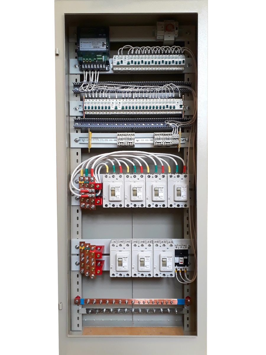 - ✅ Полная комплектация — возможна поставка как пустых корпусов, так и щитов с установленным оборудованием (автоматы, счетчики, УЗО, шины).